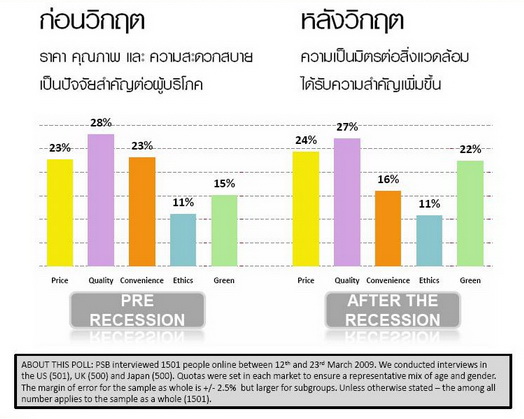 ข้อมูลจาก PSB Survey on Sustainability in the 2009 Recession ระบุว่า นอกจากปัจจัยในเรื่องราคา คุณภาพ ความสะดวกสบาย และคุณธรรมในการประกอบการแล้ว ปัจจัยที่มีผลต่อการตัดสินใจซื้อของผู้บริโภคในเรื่องสิ่งแวดล้อมหรือกระแสสีเขียว (Green) ช่วงหลังวิกฤต เพิ่มสูงขึ้นเป็นร้อยละ 22 เมื่อเทียบกับช่วงก่อนวิกฤตซึ่งมีสัดส่วนอยู่ที่ร้อยละ 15 ได้กลายเป็นปัจจัยที่สาม (Third Factor) ในการตัดสินใจซื้อของผู้บริโภคที่มีความห่วงใยในความปลอดภัย สุขอนามัย และคุณภาพชีวิต รองจากเรื่องราคาและคุณภาพ ส่งผลให้ธุรกิจต้องปรับสายผลิตภัณฑ์และบริการรวมทั้งกระบวนการผลิตขององค์กรเพื่อตอบสนองต่อพฤติกรรม
