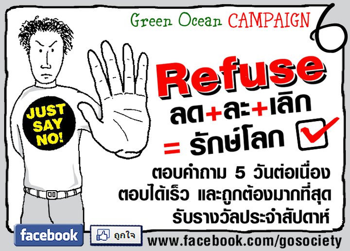 รักษ์โลก สร้างอุปนิสัยของการ Refuse = ปฏิเสธสินค้าฟุ่มเฟือย ปฏิเสธความอยากได้ตามกระแส ร่วมตอบคำถาม 5 วันต่อเนื่อง ผ่านหน้าเฟซบุ๊ค Green Ocean Society ท่านใดที่ตอบคำถามได้รวดเร็ว และถูกต้องมากที่สุด จะได้รับรางวัลประจำสัปดาห์ อันดับหนึ่ง บัตรของขวัญจาก Big C มูลค่า 500 บาท อันดับสอง กล้องโลโม่ 3 ตา มูลค่า 450 บาท และอันดับสาม เสื้อโปโล CSR มูลค่า 350 บาท (เริ่มวันจันทร์ที่ 4 - ศุกร์ที่ 8 เม.ย.54)