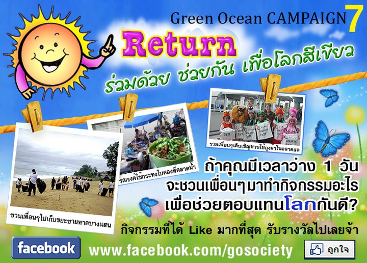 ร่วมด้วย ช่วยกัน เพื่อโลกสีเขียว ร่วมคิดกิจกรรมที่จะช่วยกันเพื่อโลกสีเขียว ภายใต้หัวข้อ “ถ้าคุณมีเวลาว่าง 1 วัน จะชวนเพื่อนๆ มาร่วมทำกิจกรรมอะไรกันดี เพื่อตอบแทนคืนแก่โลก” ผ่านหน้าเฟซบุ๊ค Green Ocean Society กิจกรรมใดที่ได้รับการคลิก Like-ถูกใจ มากที่สุด จะได้รับรางวัลประจำสัปดาห์ อันดับหนึ่ง บัตร BTS มูลค่า 500 บาท อันดับสอง เสื้อโปโล CSR มูลค่า 350 บาท และอันดับสาม หูฟัง Elecom มูลค่า 250 บาท (เริ่มวันจันทร์ที่ 18 - อาทิตย์ที่ 24 เม.ย.54)